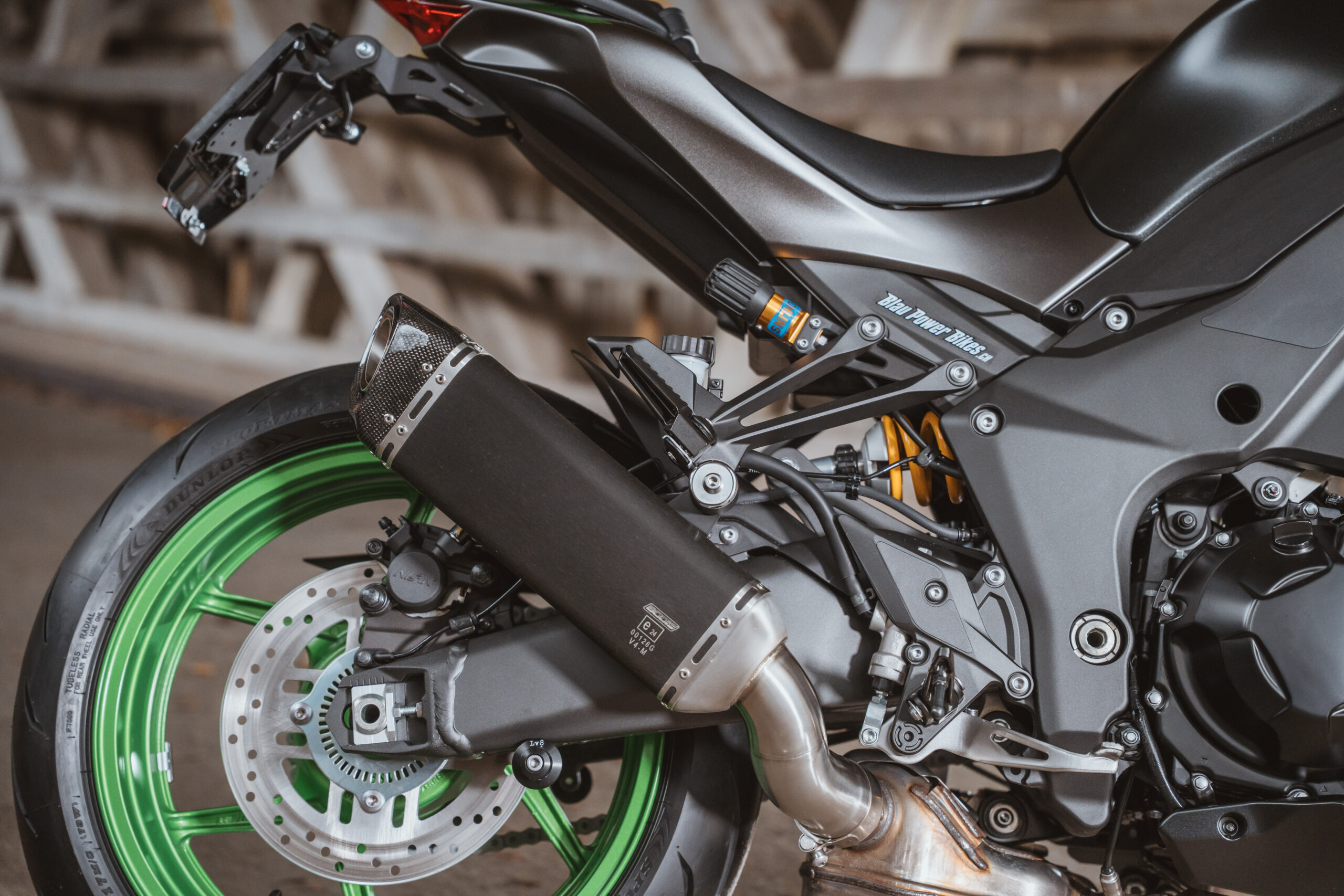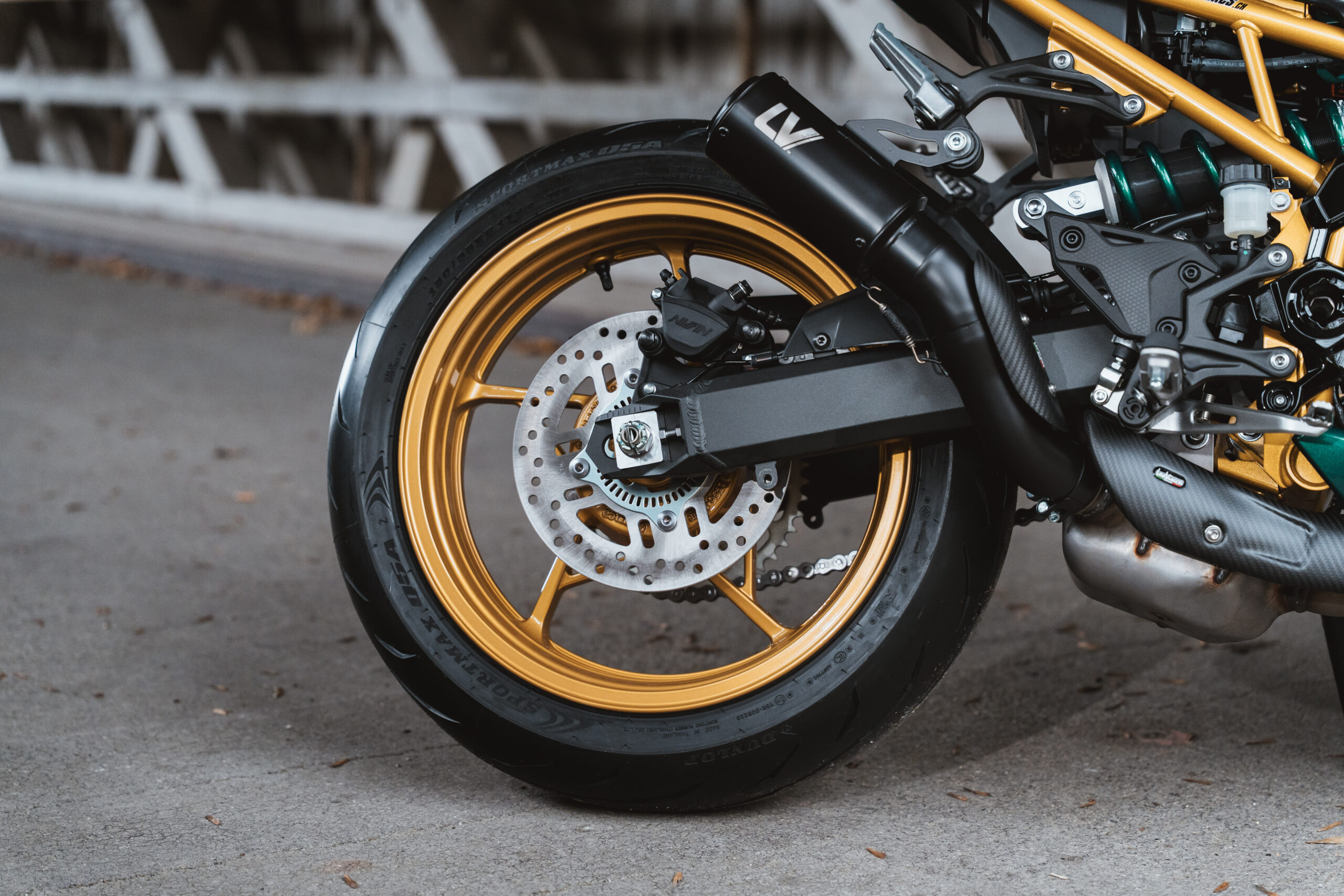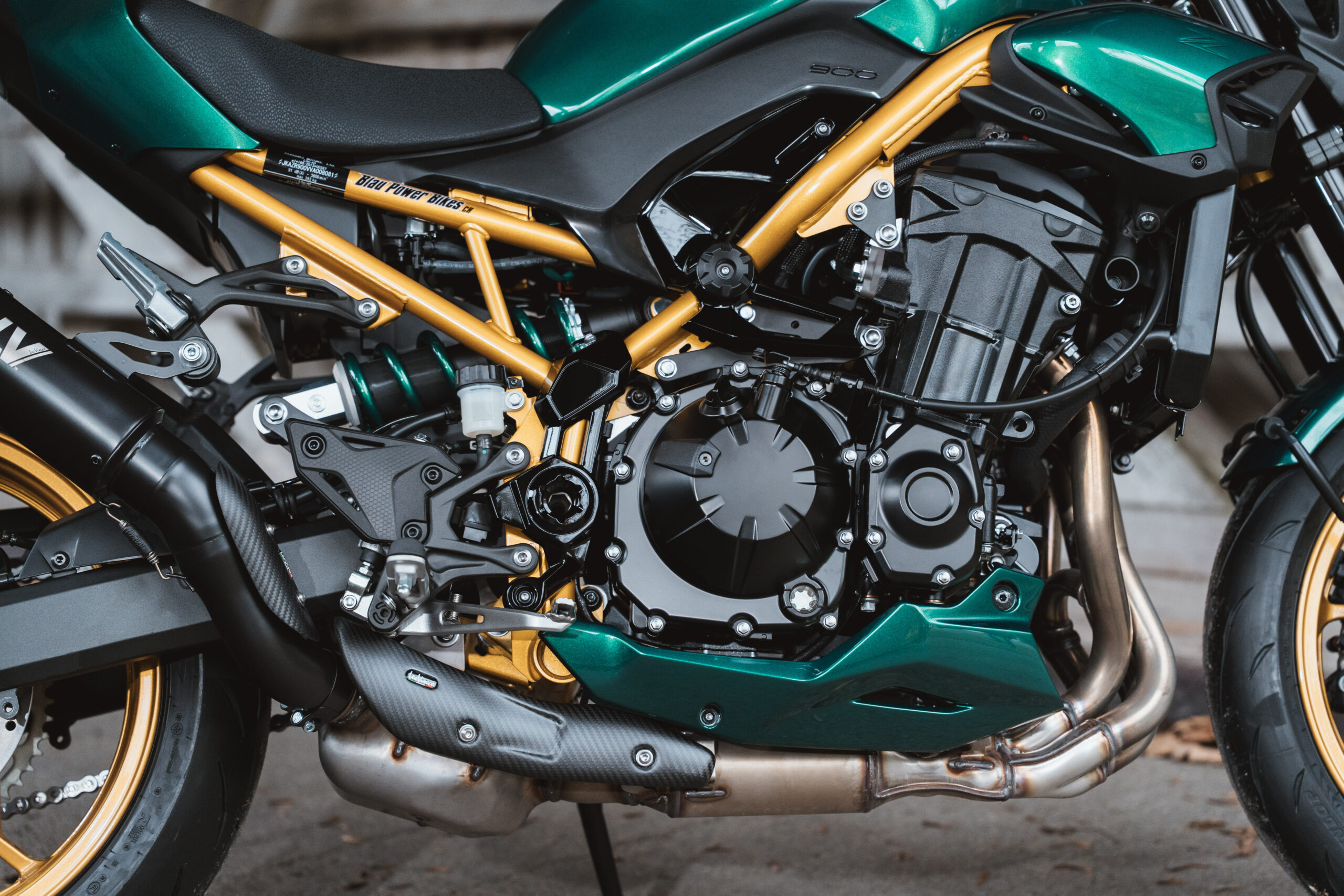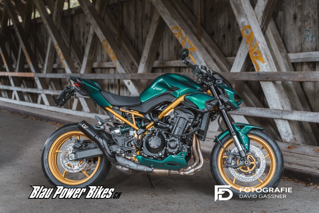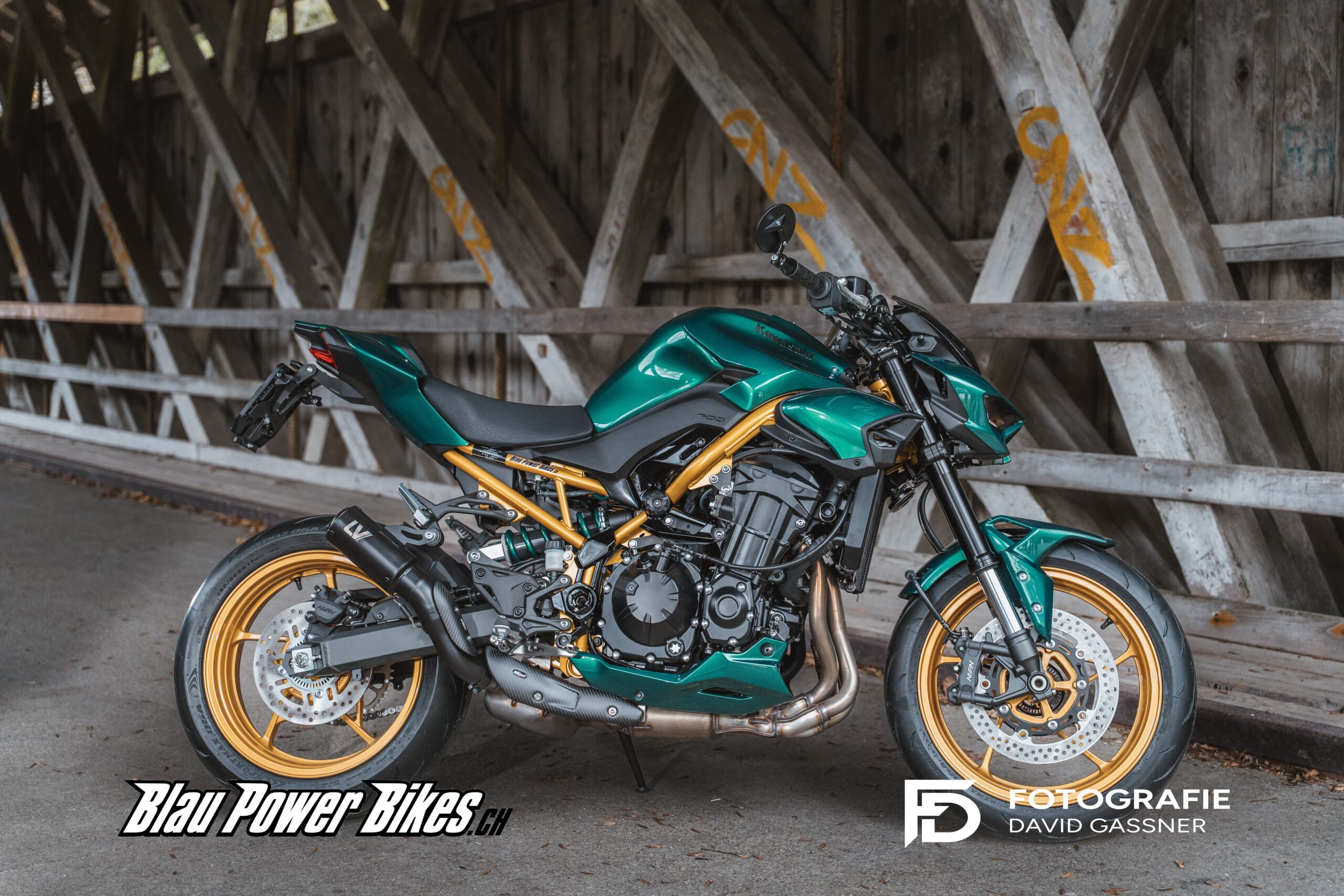 Als Basis haben wir das Z900 Modell 2026 mit original goldenem Rahmen genommen. Sonderlackierung in green und Felgen in gold. Dazu noch etwas optimiert mit Heckumbau, LeoVince Auspuff, runden Spiegeln, Soziusabdeckung…