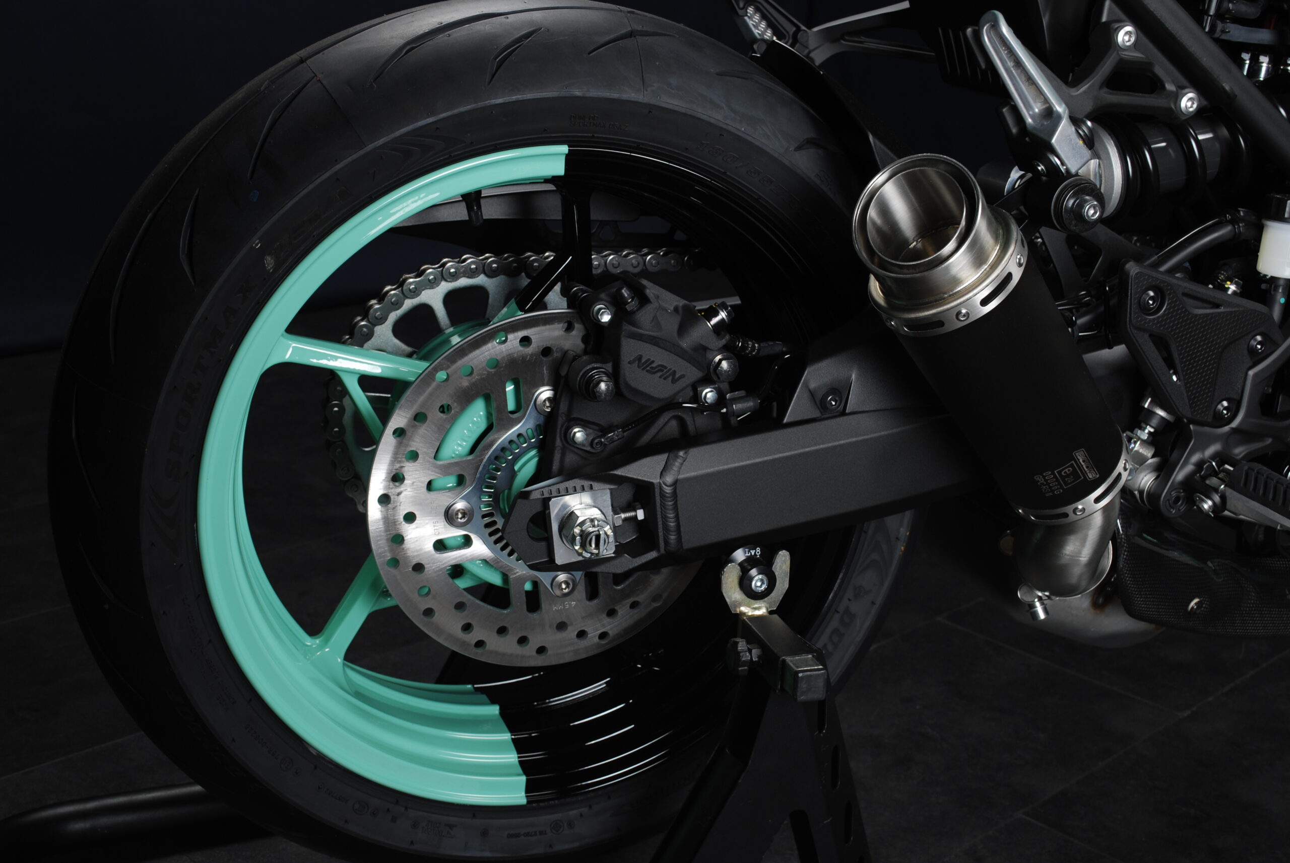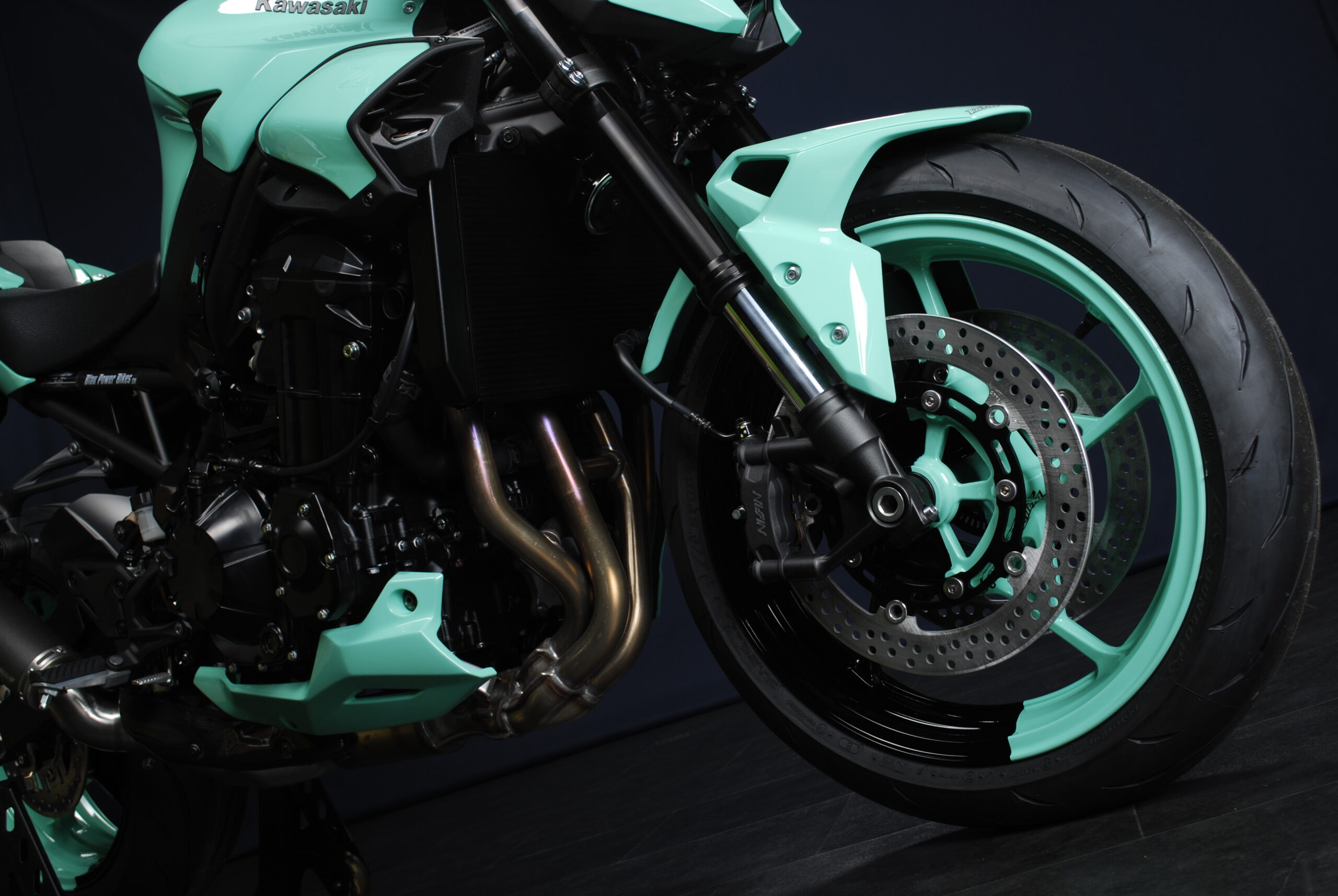 Hier haben wir einer Z900 MY23 eine auffällige Sonderlackierung in türkis verpasst, mit Heckumbau, Lenkerendspiegeln „glaslos“, Tankschriften + Embleme lackiert, Auspuff SC Project + Auspuffbeschichtung.